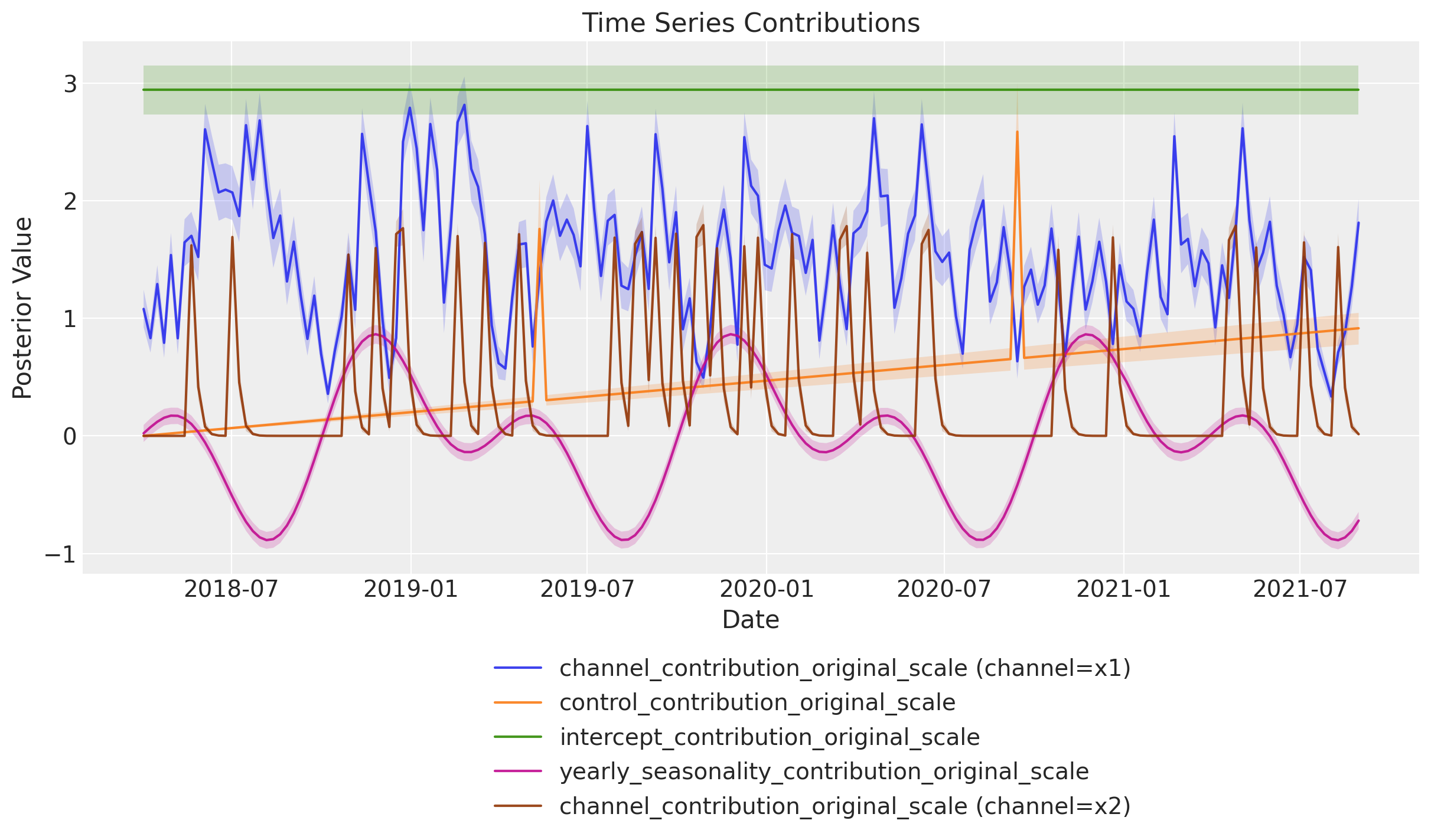 Remark: By design, \(x_{1}\) should resemble a typical paid social channel and \(x_{2}\) an offline (e.g. TV) spend time series.